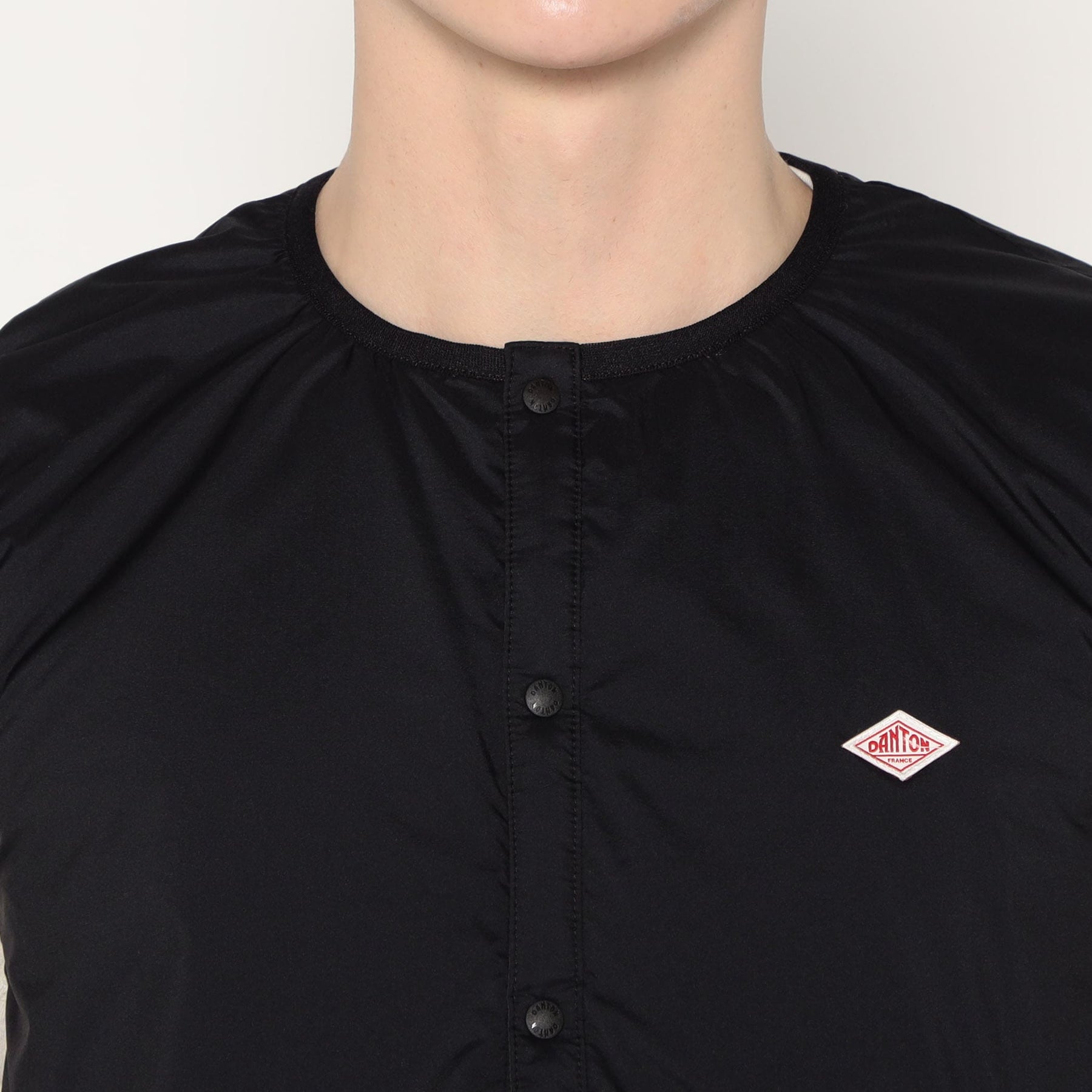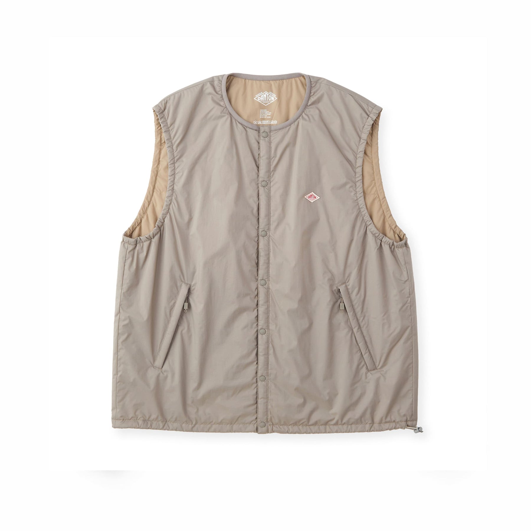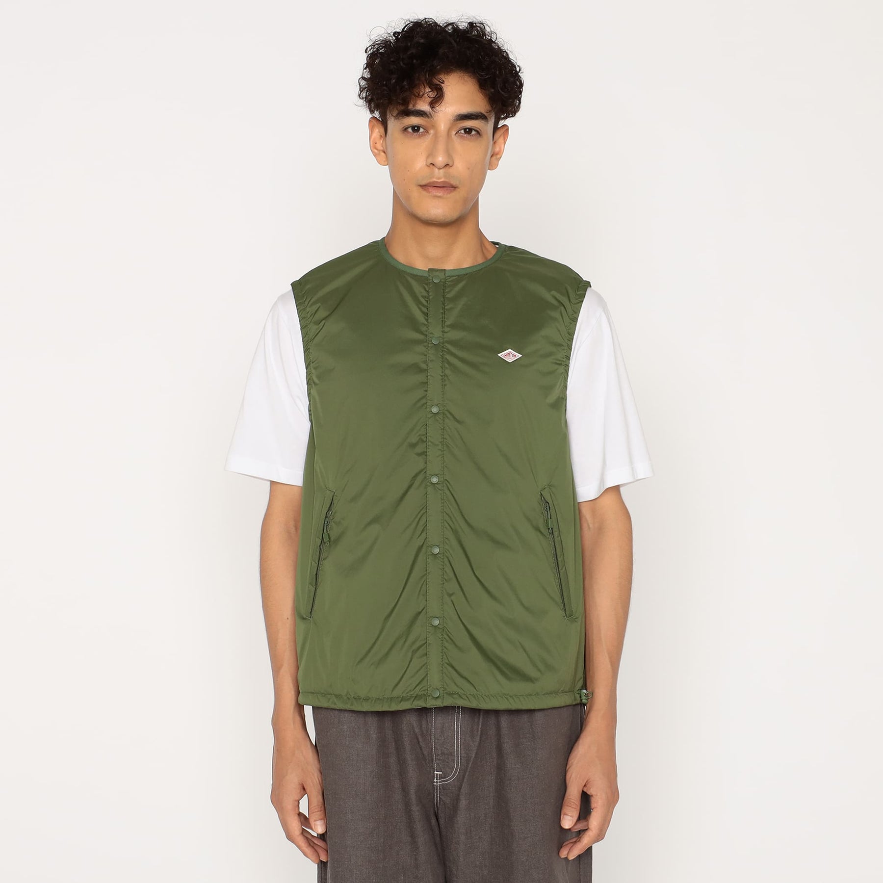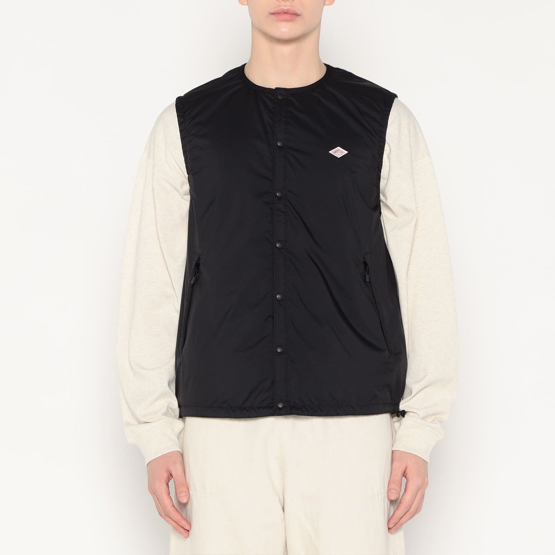 • ミドルレイヤーとしても活用できる、ジャストサイズの中綿入りノーカラーベスト