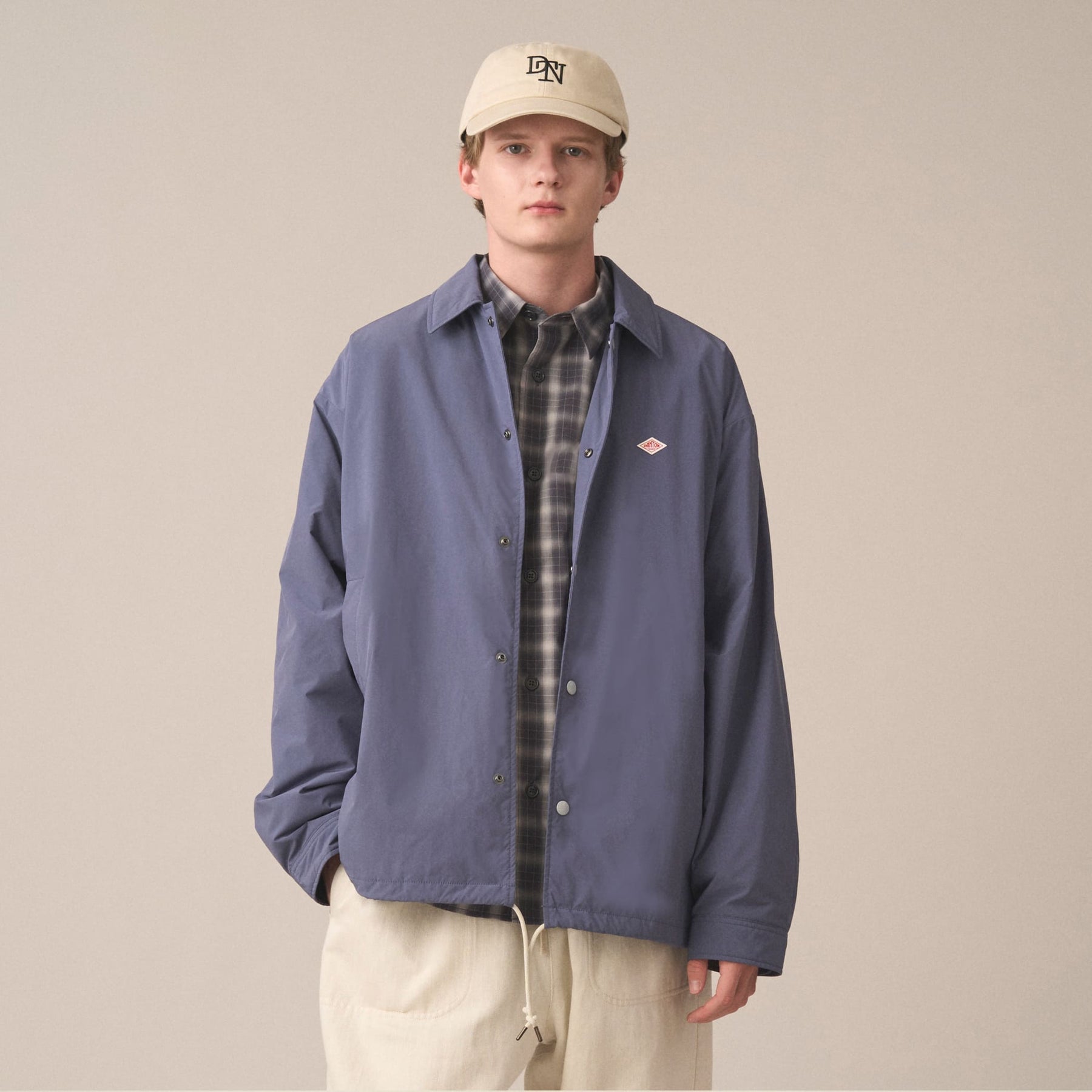 - DANTON刻印入りのドット釦と裾の配色コードが特徴